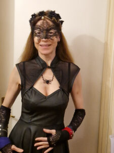 Et puis il y a les rencontres avec des inconnus… C’est la magie de la Nuit Dèmonia, les gens viennent souvent de loin, et tout le monde échange et se parle en toute liberté : des petits mots sur nos tenues, la soirée, le lieu… J’ai soif de rencontres et je demande à mon cavalier de soirée d’aller vagabonder de son côté pour en profiter ; on se donne rendez-vous plus tard devant ce bar ! (Je n’ai pas réussi à bouger d’un pouce entre les retrouvailles, les rencontres, les performances qui se déroulaient juste devant moi ! Il m’a retrouvée exactement là où il m’avait quittée.)