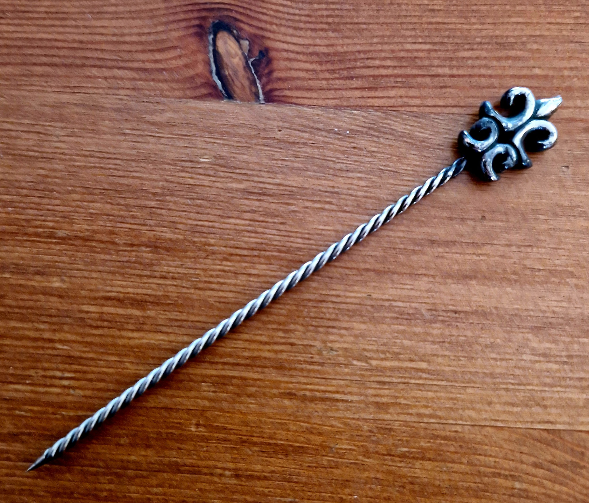 J’ai choisi ce collier qui m’a plu tout de suite avec son lien de cuir et son immense anneau, avant d’aviser de belles épingles torsadées, comme des épingles à chapeaux ou à cravate (un petit air 19e qui me plaît beaucoup !), ornées d’un joli motif. Un objet que l’on peut facilement garder sur soi, toujours à portée de main — le créateur le pique dans ses cheveux !