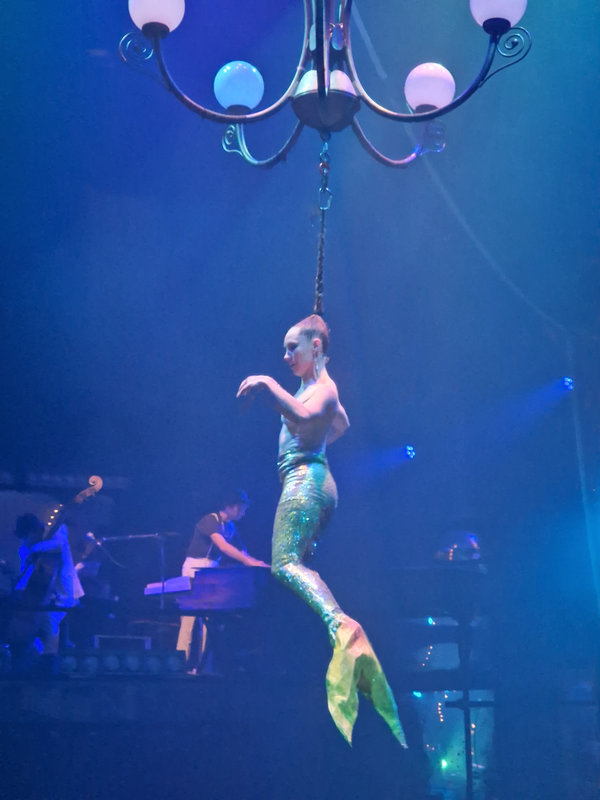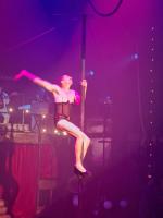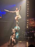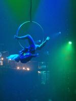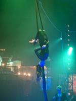 Les artistes se succèdent sur scène : une avaleuse de sabres et cracheuse de feu qui roule des yeux et nous tire la langue ; une funambule en talons, taquinée par en dessous par des « complices » qui brandissent des pics, mettent le feu à sa corde… ; des jongleurs ; des trapézistes (l’une d’entre elles a fait « exprès » de tomber ! Je pense que mon soumis va en garder des bleus au bras pendant quelques temps) ; une incroyable contorsionniste (elle fume avec ses pieds !) ; des acrobates évoluant dans un long ruban, des chaînes ; une sirène retenue pas ses seuls cheveux… et « cerise sur le gâteau » annonce le maître de cérémonie : un pôle-danseur tout nu.