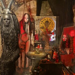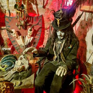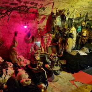 De nombreux masques crées par l’artiste sont accrochés aux murs, et créent une ambiance mystérieuse, étrange et ensorcelée, à l’image du maître des lieux, gothique jusqu’au bout des ongles.