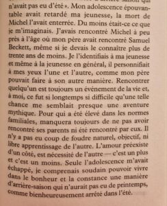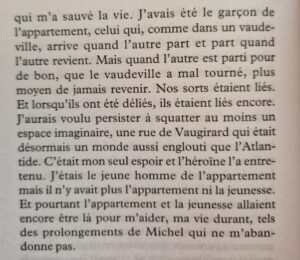 La dernière partie de ce livre de souvenirs pas comme les autres m’a un peu moins plu, je préférais quand l’auteur évoquait sa joyeuse bande d’amis et d’amants. Il y est question de l’amour entre un père et son fils, un amour compliqué par le fait que le père de l’auteur était un grand intellectuel reconnu, à la personnalité écrasante, propriétaire des Éditions de Minuit. Père et fils ont en commun leur goût pour la littérature, mais connaissent de nombreux frottements et malentendus, qu’analyse l’auteur en comparant avec la relation naturelle, simple, fluide qu’il a vécue avec Michel Foucault.