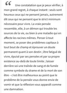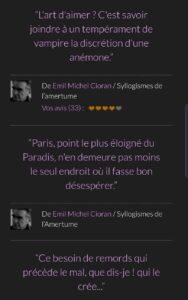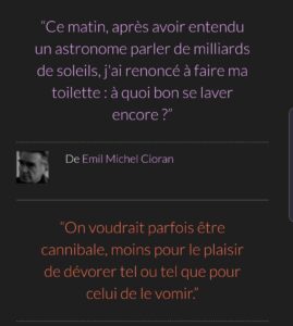Maintenant, je souris toute seule devant ses citations pleines d’amertume, décalées… une sorte de Houellebecq philosophe ! 😋