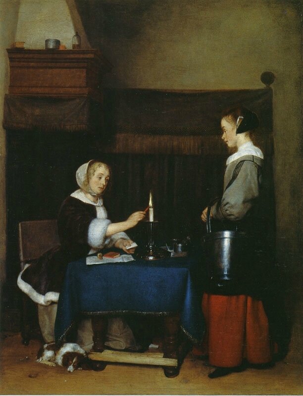 Madame s’ennuyait entre sa viole de gambe et sa dentelle, à peine distraite par son chien de manchon, et voilà qu’une occupation intéressante se présentait : un soupirant, une déclaration… elle tomba éperdument amoureuse dès les premières lignes, et s’attabla aussitôt pour répondre sur l’heure quelques mots bien tournés. Sa servante s’impatientait, attirée par l’animation du marché. Enfin Madame l’envoyait faire une course ! Elle n’en pouvait plus de nettoyer les sols… battre le pavé, sortir au soleil la réjouissait, et nul ne lui reprocherait de musarder en route ! Quand Madame aurait donc fini ses écritures ! Que c’était long…