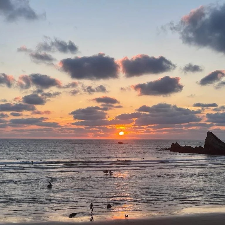 Tous les soirs, j’ai rendez-vous avec le coucher du soleil, spectacle flamboyant toujours changeant, agrémenté de silhouettes en ombres chinoises : des surfeurs qui déambulent ou pataugent en attendant les vagues en vain….