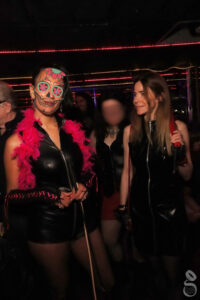 Je papillonne sans jeter mon dévolu sur qui que ce soit, avant de me poser sur une banquette pour me faire masser les pieds par un ami ; c’est toujours un plaisir en début de soirée. D’après-midi plutôt, mais entre la lumière tamisée, les tenues, la musique, nous perdons vite la notion de l’heure et nous sommes plongés dans une ambiance hors du temps. Mon soumis masseur me montre son petit fouet, et m’invite à m’exercer sur lui. Je suis curieuse, nous montons à l’étage, et je me lance avec précaution. Aïe, mon premier coup l’a touché sur les flancs, je dois reculer, me concentrer, et viser les fesses ! Et à ce petit jeu-là, il me semble que je progresse à grande vitesse… Je m’enhardis, je prends de l’élan, je touche au but à chaque fois ! Au bout d’un moment, je décide de prendre une pause, j’ai le bras tout endolori par le poids du fouet, pourtant léger – On parle souvent des fesses meurtries des pauvres soumis, mais jamais des bras courbaturés des dominatrices ! Il est vrai que je suis peu sportive ^^