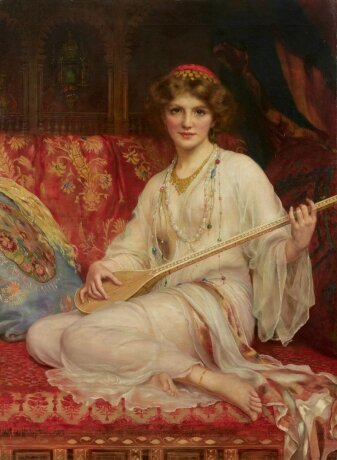 Le fantasme préféré des hommes : elle est à peine vêtue d’un voile transparent qui ne cache pas grand chose, et joue mollement de la mandoline, fixant des yeux son soupirant… (Manuel Ruiz, j’ai pensé intensément à toi et à la nouvelle que tu viens tout juste de publier sur le site nouvelles-erotiques : La Tour)