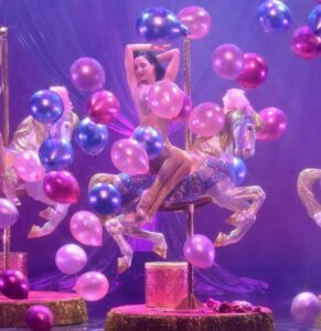 Tours de magie, paillettes, strass, danses ér0Tiques, teasing… dans une ambiance rose bonbon, ou plus fet*sh, comme ce tableau évoquant le monde de l’entreprise et son management au son du claquement des fouets… Des fouets qui s’enroulent amoureusement autour de la taille du collègue, de soi… Jolie métaphore !