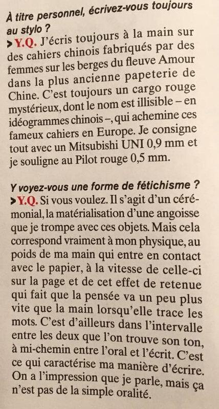 Je les choisis avec soin, ils doivent être légers, pas trop épais ni trop gros, — je parle toujours des stylos-plume ^^ —, je ne m’intéresse qu’à ceux destinés aux lycéens et étudiants, les plus luxueux aggravent mes tendinites avec leur poids. Je préfère qu’ils pèsent à peine entre mes doigts et méritent enfin leur nom, pour les oublier, me concentrer sur l’essentiel : l’écriture.