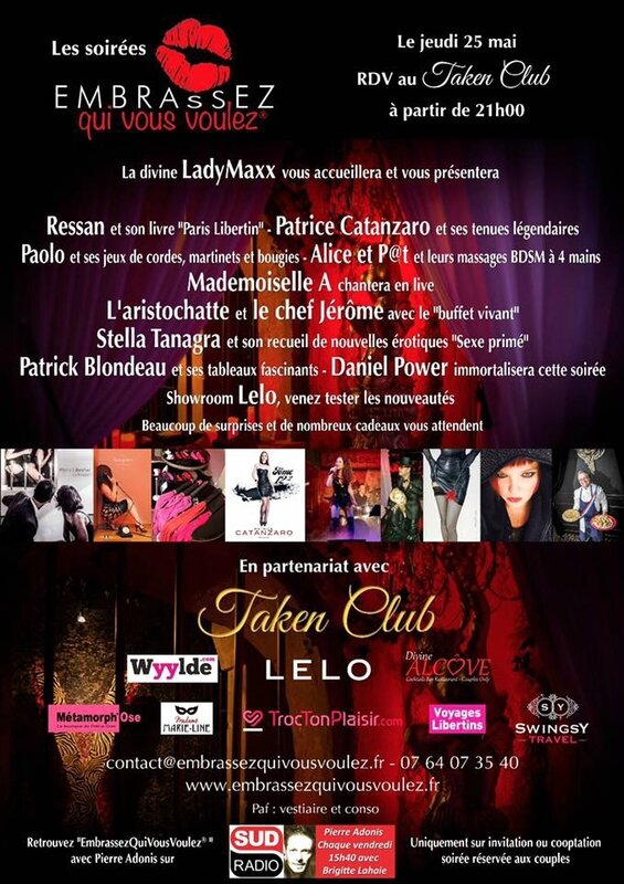 Très vite, nous croisons moult amis et connaissances, et nous ne savons plus où donner de la tête ! Je retrouve plein d’amis des Ecrits polissons et leur super animatrice Flore Cherry ; des amis des soirées bdsm, dont Pat et Alice, nos masseurs à quatre mains préférés ; des amies blogueuses, Miss Dactari, L’Aristochatte ; de nombreux acteurs de l’érotisme, déjà croisés dans d’autres soirées ou sur Facebook : Swingsy.fr (site de rencontres libertines), Troctonplaisir.com (la bourse de l’érotisme), Wyylde.com, qui nous offre un éventail plus que bienvenu dans cette ambiance muy caliente, gangbangshards.com (organisation de soirées privées hard), Metamorph’Ose (vêtements Fetish) et j’en oublie…
