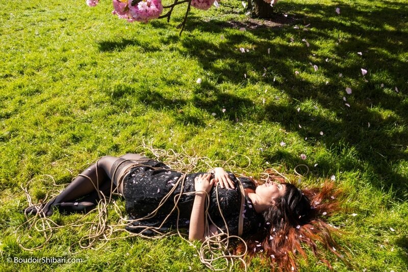 Nous sommes tous conviés à rejoindre le sous-sol pour assister à une démonstration de Shibari. Nous nous serrons autour de la scène, symbolisée par un drap rouge. Une musique méditative emplit la pièce. Je m’assois sans façon sur les genoux de notre cuisinier préféré et bientôt j’oublie tout, fascinée par la séance qui se déroule sous mes yeux.