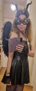 Je finis par fausser compagnie à tout le monde, j’entraîne un soumis dans le coin le plus reculé et sombre du donjon pour lui faire des misères. Évidemment, des amis me surprennent en plein élan, me taquinent, tandis que d’autres me demandent plus tard où j’étais passée « on t’a cherchée partout ! 😄 » – dur dur de faire des bêtises avec autant de chaperons veillant sur moi et ma vertu !