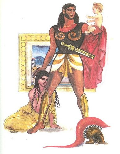 Cette histoire m’a remuée car elle a ravivé des émotions d’enfant, quand j’ai lu vers huit ans une adaptation de « L’Iliade et de l’Odyssée ». Innocente encore, je ne comprenais pas mon trouble face à la détresse d’Andromède par exemple. Une illustration en particulier me fascinait : on voyait Hector, immense et superbe, tenant son minuscule bébé au creux de sa main, tandis que sa femme à ses pieds l’implorait et embrassait sa jambe. (magie d’Internet qui m’a permis de la retrouver).