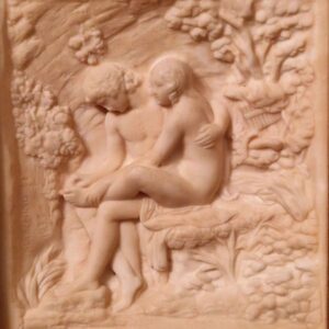 Ce petit tableau de la maison de vacances, un bas relief plutôt, je le connais depuis toujours, sans l’avoir jamais vraiment regardé.. écrasé, presque effacé par un cadre doré trop grand pour lui…