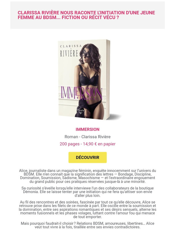 Mon roman Immersion est cité ce mois-ci dans la newsletter de la Musardine, juste après La culotte d’Esparbec, ce qui représente the consécration absolue 😊, avec la question que l’on me pose souvent, étalée cette fois au grand jour 😱 😅 : « fiction ou récit vécu ? » (un jour je dirai tout 😉) .