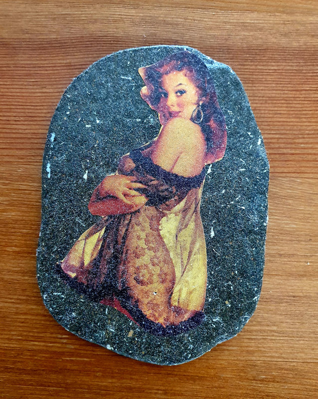 Et soudain je le vois ! Là, entre deux pierres de cette belle cave voutée, lové dans un interstice juste à sa taille : mon nouveau galet, juste sous mon nez ! J’oublie les consignes de pose, et je m’en empare. Je le contemple bouche-bée, il est vraiment magnifique ! Une jolie jeune femme se tient à genoux, dans une position de soumission, mais son regard est coquin à souhait. Au dos, une dédicace : » Merci Clarissa d’avoir joué avec moi « .