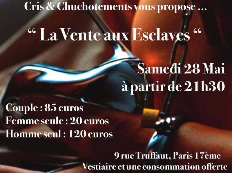 — Oui ! Tu te rendras à « La vente aux esclaves » organisée samedi prochain, seule, avec ton collier et ta nouvelle robe, j’y tiens, et tu te vendras au plus offrant, pour la pratique que tu souhaites… Bien sûr, tu es libre de fixer tes limites comme tu veux !