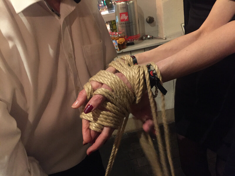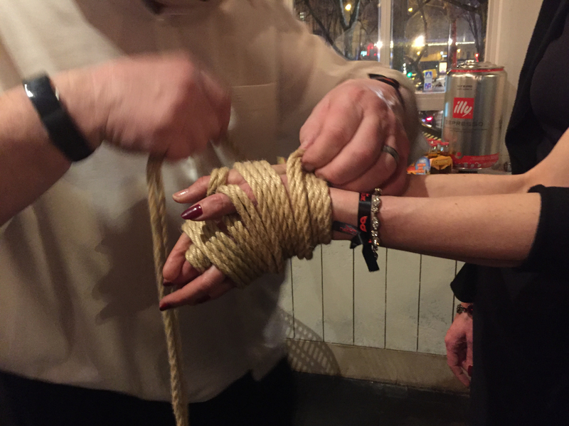 Paul Fontaine nous a offert une démonstration de shibari lors du dîner des lecteurs et auteurs de littérature érotique du 17 mars dernier. J’ai regardé, fascinée, les cordes s’enrouler lentement autour des bras de deux amies, j’ai eu envie de sentir à mon tour les cordes sur ma peau.