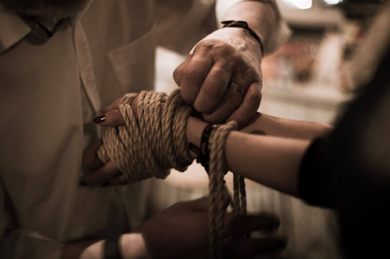 Avec des geste lents, sûrs, il entoure patiemment nos mains et nos bras de cordes, serrant à peine, pour seulement nous faire ressentir la douce pression des cordes.