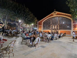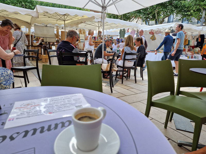 On échange force sourires et regards (je me fais sans doute des idées, et je romance un peu, je ne suis pas autrice érotique pour rien ^^), avant que je me décide à quitter le comptoir pour m’assoir en terrasse et observer l’animation du marché. Les souvenirs et les bijoux ont laissé la place aux produits du terroir ; c’est encore plus sympa !