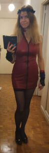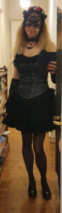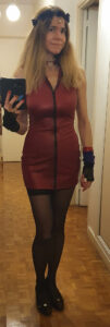 J’ai prévu une deuxième tenue, plus fetish, mais je n’ai pas anticipé que ma tenue de princesse des ténèbres prenait bien plus de place que ma fine robe wetlook ! Je n’arrive plus à tout mettre dans mon sac à dos… Heureusement la jeune femme du vestiaire fait des merveilles et réussit à tout accrocher sur un seul cintre, ouf !