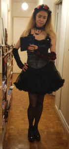 Quelques selfies pour garder un souvenir de ma tenue : Une robe rouge en wetlook pour La Nuit Dèmonia, un faux corset et une jupette de tulle pour Le Bal des Vampires, avec des fleurs dans les deux cas – romantique un jour… (il n’y a pas de photos de La Squat, c’est une soirée sans photo et c’est très bien comme ça ^^)