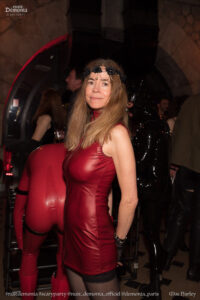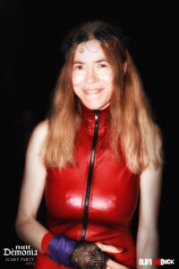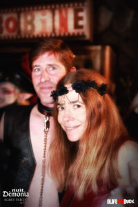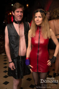 Et puis la soirée m’absorbe, je quitte mon rôle d’observatrice pour en être partie prenante. Je me retrouve immergée jusqu’au cou dans un océan de musique et de sensations… de la musique New wave au début, avec tous nos groupes préférées, et ensuite de la techno qui nous fait vibrer des pieds à la tête ! Certains regrettent la musique métal, mais j’avoue que la techno me plonge dans une transe hypnotique dont je ne sors qu’à l’aube, hagarde…. Trop bon de danser follement en regardant de belles performances. Elles font leur grand retour à la Nuit Dèmonia, orchestrées par Otomo De Manuel : des acrobates, des danseurs, des performers se produisent régulièrement sur une estrade près du DJ et sur une autre au milieu du dance floor, et ajoutent encore à la magie de la soirée ! Et entre deux shows, les estrades sont investies par des danseurs plein d’énergie qui se donnent à fond.