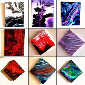 Ses toiles me font penser à de la lave en fusion, ou à des surfaces de planètes étranges… J’imagine des vagues colorées, des méandres de rivières avec des éclats de couleurs, comme des fleurs… Elles sont superbes, fantastiques, SF, oniriques…