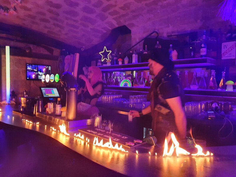 Super accueil du patron en total look mi Burning man – mi festival Hell fest : kilt de cuir, chapeau de cuir. Il met le feu littéralement en traçant un chemin d’alcool sur le comptoir et enflamme la soirée ! Son associée est craquante en héroïne de manga avec sa tenue rose et ses longs cheveux fluo.