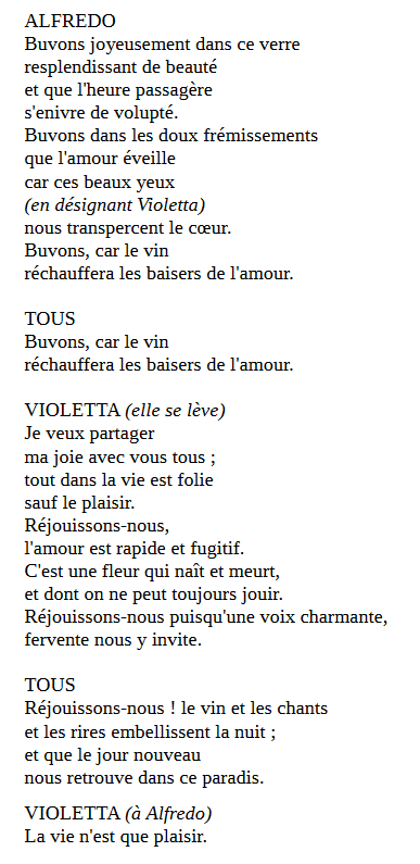 – Photo : extrait du livret, début de l’opéra. Il manque la réplique d’Alfredo à la fin (elle était sur la page suivante) : « Pour ceux qui ne connaissent pas encore l’amour »