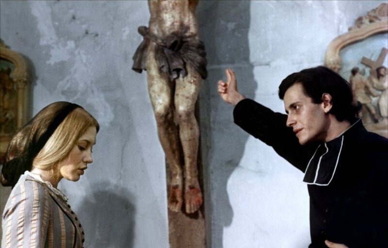 Il s’efface pour la laisser passer. Elle marque un temps d’hésitation avant de franchir le seuil, attirée par la lumière des bougies, les senteurs d’encens, et la longue silhouette en soutane qui lui tend la main en souriant… (Puis, déchaînement orgiaque)
