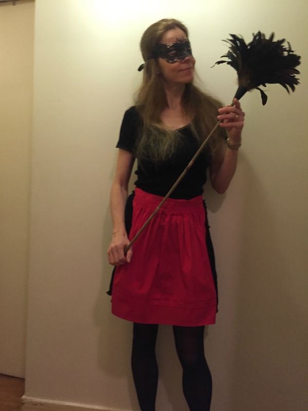Il ne nous reste plus qu’à prendre la photo. Ce fut comme d’habitude, à l’arrache’, le matin même, dix minutes avant qu’il ne doive partir pour son travail. J’ai retrouvé le petit tablier de soubrette rouge qui irait à merveille, mais il est tout chiffonné, au fond du coffre de déguisements… qu’à cela ne tienne, mon chéri s’empare du fer à repasser, en deux minutes, mon tablier d’opérette est comme neuf. J’aurais voulu prendre une photo tellement il était sexy en train de repasser ! Immense, penché sur le minuscule morceau de tissus rouge…