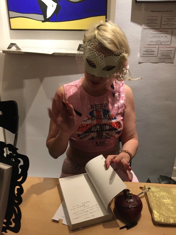 Les défis d’écriture mettent un grain de folie dans le salon. Je retrouve l’ambiance des écrits polissons : une phase d’écriture fébrile ponctuée de fous rires, suivie de lectures ardentes. Je reconnais quelques ténors des Écrits polissons qui m’amusent bien. De mon côté, je n’écris rien, trop occupée à papillonner entre les stands et les participants – j’ai même oublié de prendre des photos ! Je joins les trois que j’ai prises -, avant de me finir au bar avec quelques piliers qui se reconnaîtront 😉