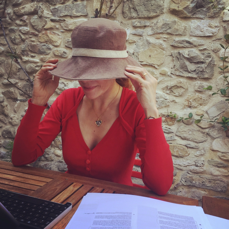 La réalité : j‘ai l’air de travailler là, mais on ne voit pas le pastis, ni le torse nu de l’homme qui prend la photo… Son visage à demi caché par le téléphone, il tourne autour de moi, mitraille, inconscient de ses muscles bronzés qu’il agite sous mon nez. Cachant mon visage, je baisse les yeux, je regarde son ventre, son maillot de bain, tachant de deviner l’effet de mon décolleté. Il reste sage, concentré sur sa mission de photographe. Je vais devoir me jeter sur lui !