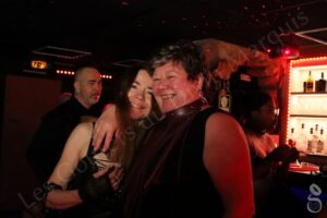 Une fois mes bougies soufflées, place aux jeux ! J’admire l’introduction de sondes urétrales sous la houlette de Carolyne, une opération délicate qui nécessite du doigté et des précautions d’hygiène rigoureuses. Moult sensations à la clef pour le soumis, des sensations encore renforcées par des électrodes placées au bon endroit et des secousses électriques bien dosées. Un soumis heureux, affectueusement surnommé « Jouet », partenaire favori de Carolyne. Elle lui a remis officiellement son collier un peu plus tôt devant nous tous, en posant de très jolis mots sur leur relation et leurs sentiments envers l’un envers l’autre : « ce n’est pas de l’amour, c’est plus que de l’amitié, même si l’on est amis aussi, c’est un lien très fort, respectueux, un lien de domination-soumission, indescriptible, ressenti par ceux et celles qui le vivent. Un lien au grand jour, sans cachotteries ! ». Je l’ai vécu moi aussi, ce vertige !