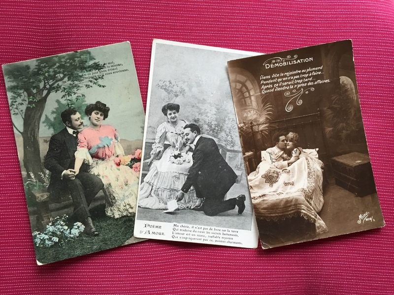 Ces cartes naïves, désuètes, simplettes, avec leurs vers de mirliton cocasses à souhait sont un touchant témoignages du passé : déclarations d’amour brûlantes, préoccupations frivoles juste avant la guerre, amitiés de pensionnat… à chaque fois, un début d’histoire.