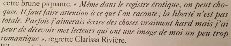 La journaliste m’a demandé si je gagnais ma vie en tant qu’auteure érotique, question légitime, mais à laquelle on ne pense jamais… J’ai répondu non, écrire est avant tout un loisir… ai-je vraiment dit que je ne gagnais pas un « kopeck » comme je le lis sur l’article ? Gloups… Je ne crois pas ^^ Mais sinon, honte à moi, je m’excuse auprès de mes éditeurs préférés qui travaillent comme des fous et qui ont toujours réglé mes droits d’auteur et émoluments divers rubis sur l’ongle ! Je pense notamment à La Musardine, aux Éditions Dominique Leroy, aux Éditions du 38, aux Éditions L’ivre-Book…