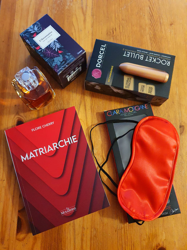 Merci beaucoup Flore Cherry et La Musardine pour l’envoi de ce livre ! J’ai été gâtée en plus, avec un parfum, un joli bandeau rouge satiné pour les yeux, et un mini sextoy doré qu’on peut emmener partout avec soi – l’accessoire indispensable des femmes matriarches !