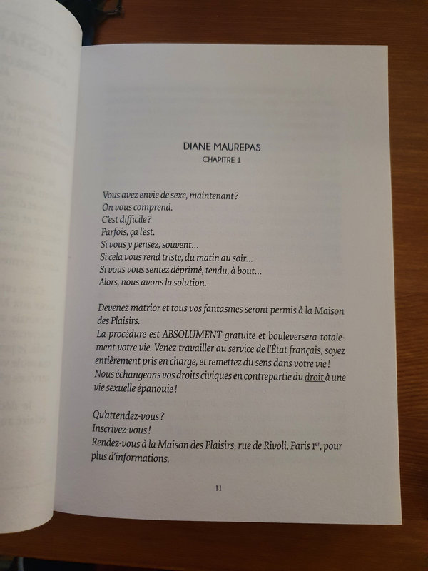 2 100 après J.-C. Excédée par la politique poussiéreuse et lasse de subir au quotidien violences et pressions masculines, la France, dans un souhait de renouveau, a placé Matriarchie au pouvoir. Ce parti féministe a offert aux hommes de renoncer à leurs droits civiques pour se mettre au service de l’État, en contrepartie d’un accès contrôlé aux » maisons des plaisirs « . Le tableau semble idyllique…