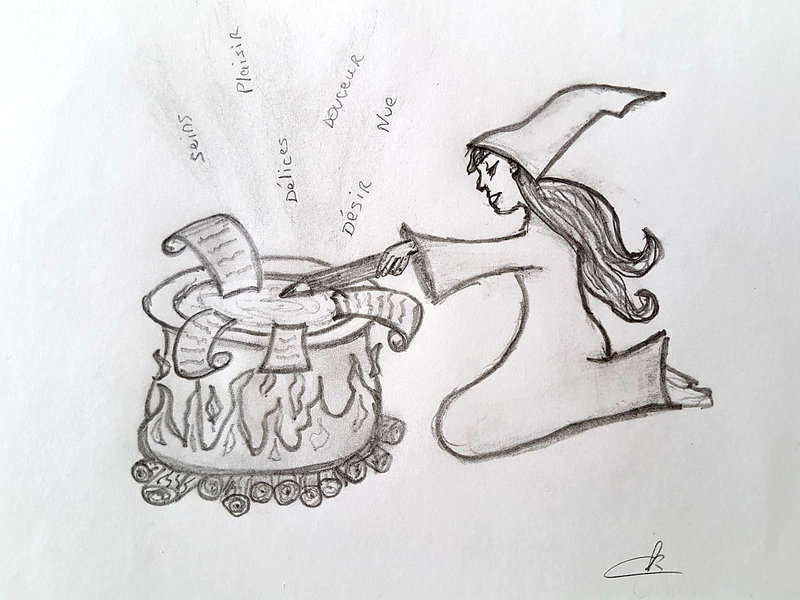 L’auteure est une sorcière qui joue avec les mots, elle les pétrit, les travaille, assaisonne de divers ingrédients : un zeste d’érotisme, de la poudre de fée, un brin de fantaisie… Elle malaxe cette pâte, ajoute des décorations, des paillettes et du sucré. Elle édulcore, rajoute du piment parfois, et une fois satisfaite, met son texte sur le feu, où il rejoint d’autres textes, en train de gentiment mijoter. La sorcière souffle sur les braises, porte ses récits à ébullition, les fait bouillonner pour qu’ils composent l’histoire la plus torride qui soit, afin de donner chaud aux futurs lecteurs.