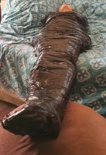 Il enduit le cellophane de lubrifiant et fait glisser ses mains tout le long de mon corps momifié, comme un massage de ma seconde peau. Elle est si fine, si collée à la mienne que je sens bien ses mains ; un contact un peu différent, indirect, à travers le voile pudique du cellophane qui induit une petite distance. Une expérience fetish délicieuse ! C’est bon de m’abandonner, je ne peux rien faire de toute façon, il n’attend rien de moi, juste de me laisser faire, et de profiter.