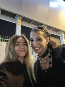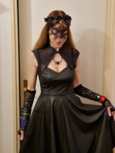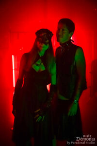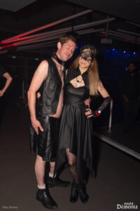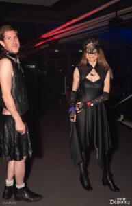 Et puis il y a les rencontres avec des inconnus… C’est la magie de la Nuit Dèmonia, les gens viennent souvent de loin, et tout le monde échange et se parle en toute liberté : des petits mots sur nos tenues, la soirée, le lieu… J’ai soif de rencontres et je demande à mon cavalier de soirée d’aller vagabonder de son côté pour en profiter ; on se donne rendez-vous plus tard devant ce bar ! (Je n’ai pas réussi à bouger d’un pouce entre les retrouvailles, les rencontres, les performances qui se déroulaient juste devant moi ! Il m’a retrouvée exactement là où il m’avait quittée.)