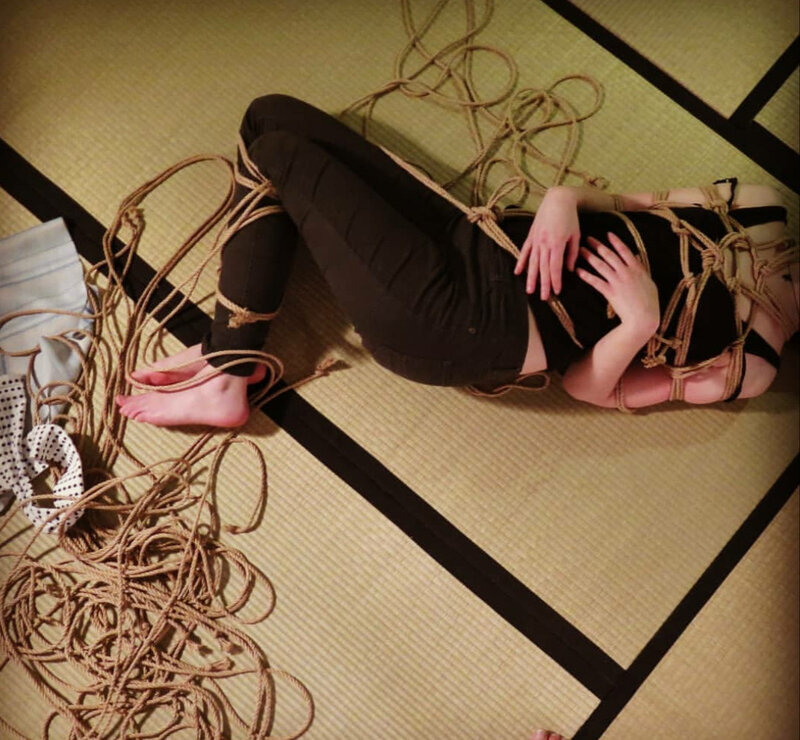 Bientôt, je n’arrive plus à garder l’équilibre en restant assise, je chute, et il m’accompagne en douceur vers le tatami pour éviter que je ne me fasse mal. ( Une « pensée de fille » me traverse l’esprit, les cordes ne vont-elles pas arracher les petites perles de mon corset ? Ce serait mieux avec une fine chemise, ou même presque nue… et puis j’oublie tout. )