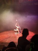 – Seul « couac », je dirais, et encore, avec le recul, je trouve ça plutôt drôle : à un moment, un artiste fait irruption sur la piste, avant de se faire « déloger » manu militari. Déguisé en CRS, il frappe son casque, ses genouillères, sa coque de protection pelvienne en rythme tout en dansant, et soudain, il crache son chewing-gum qu’il mâchouillait ostensiblement vers le public. Il atterrit… à mes pieds ! Et pourtant, je suis située en hauteur ! Ce chewing-gum si proche de mes pieds, me perturbe, je vais finir par marcher dessus sans y prendre garde. J’essaie de le pousser légèrement du pied pour l’éloigner, et évidemment, le voilà collé à ma semelle ! ça m’a un peu occupée ensuite de m’en débarrasser 😉.