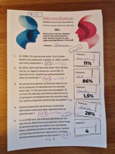 Ci-joint la fiche en question : elle symbolise l’ovule, et les petits papiers-réponses des garçons les spermatozoïdes. On a pu constater que certains essaiment plus que d’autres avec un rapide sondage à main levée ^^