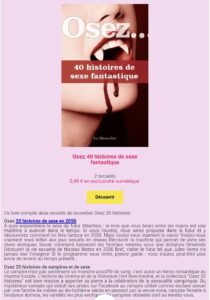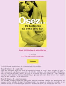Il y en a pour tous les goûts : bdsm, science-fiction, été… Des nouvelles succulentes et torrides à souhait à déguster discrètement sur sa liseuse ou son téléphone.