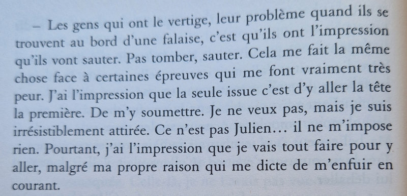 » Cela faisait des années que je n’avais plus peur de lui ; nous partagions une telle intimité que nous pouvions tout nous dire. La négociation des épreuves était un exercice que je maîtrisais parfaitement, que Julien joue à les imposer ou que je les sollicite en le provoquant. (…) il finissait par comprendre ce que je réclamais et me le donner en faisant mine d’en avoir lui-même eu l’idée. «