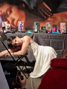 Je suis en retard pour m’installer à ma table (de tortures ) ! Je pensais avoir une demi-heure devant moi, mais j’ai… zéro minute ! Heureusement, une performance démarre sur scène, ce qui me donne un peu de répit. Une belle danseuse sexy et espiègle s’effeuille, je suis aux premières loges, juste devant la scène ! Et ensuite, j’aurai le beau stand Lelo sous mes yeux, sans jamais avoir le temps d’y aller, ce supplice de Tantale ! (Sauf à la toute fin… je considère un sextoy de poche, à emmener en vacances, quand Le son du désir nous offre une lecture au micro !)
