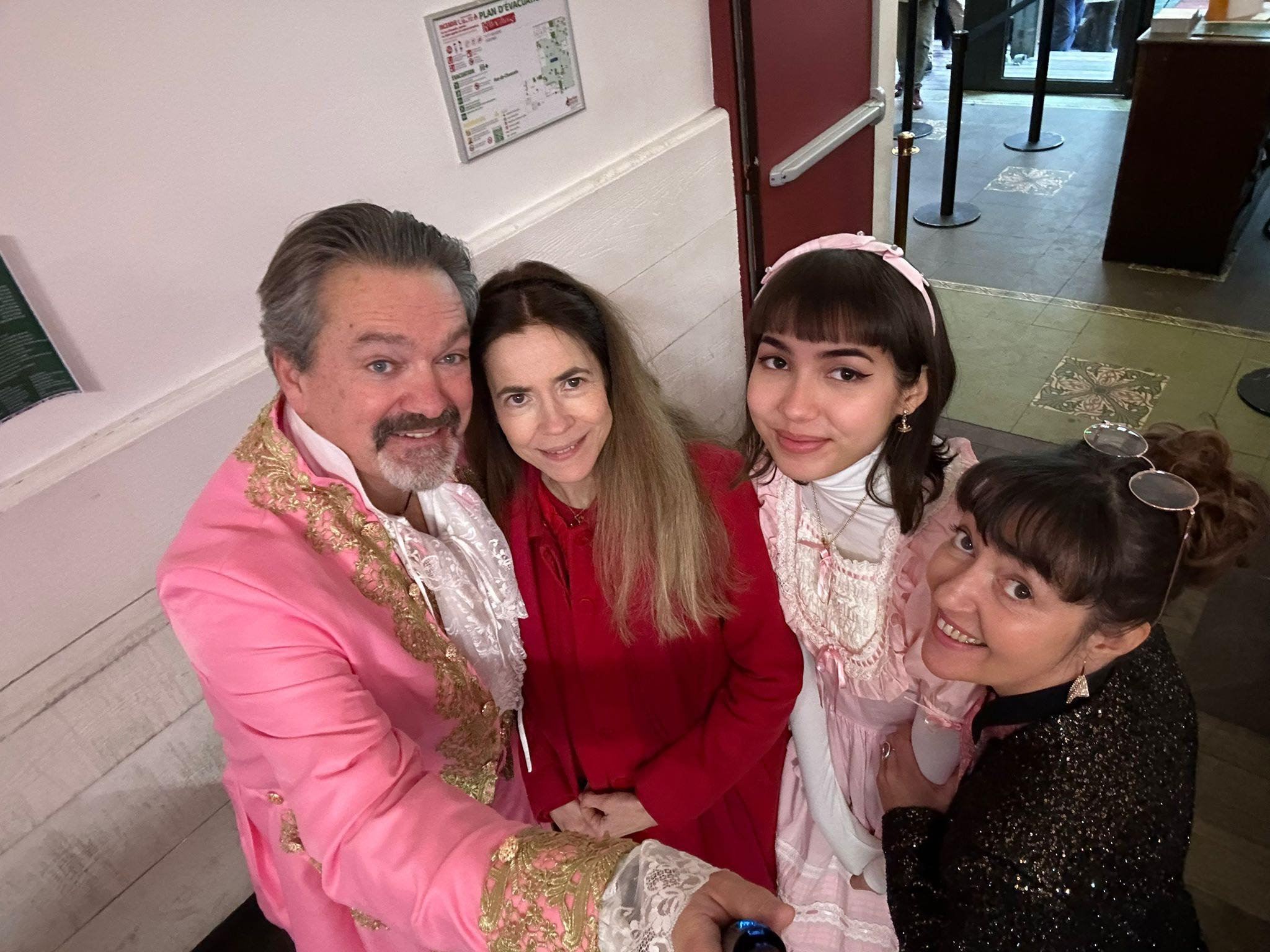 Des amis tiennent l’accueil, ils m’aperçoivent et me font signe d’entrer. Un peu confuse et ravie d’être privilégiée, je m’avance et les salue avant la cohue, quelques minutes d’éternité pour échanger les dernières nouvelles ! Ils ont tous un point commun : ils portent quelque chose de rose ! La grande maîtresse de cérémonie, Flore Cherry, et le marquis, sont tout de rose vêtus ! Le marquis est d’ailleurs en marquis…