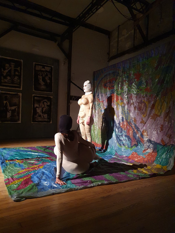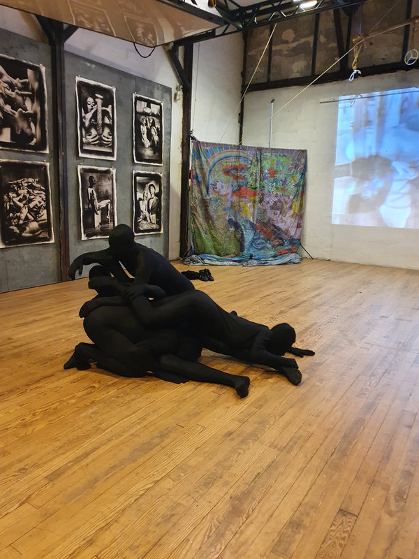 J’ai beaucoup aimé les performances qui se sont déroulées au cours de la soirée : des performers vêtus de combinaisons Zentaï noires, se mêlant les uns aux autres, se chevauchant, avant de s’étirer, se séparer… Ils évoluaient au ralenti, figures anonymes et fantomatiques, sans identité. Ombres vivantes se mouvant dans un autre espace-temps que le notre. Les artistes de Famapoil ont ensuite pris le relai, avec une séquence toujours inventive et créative.