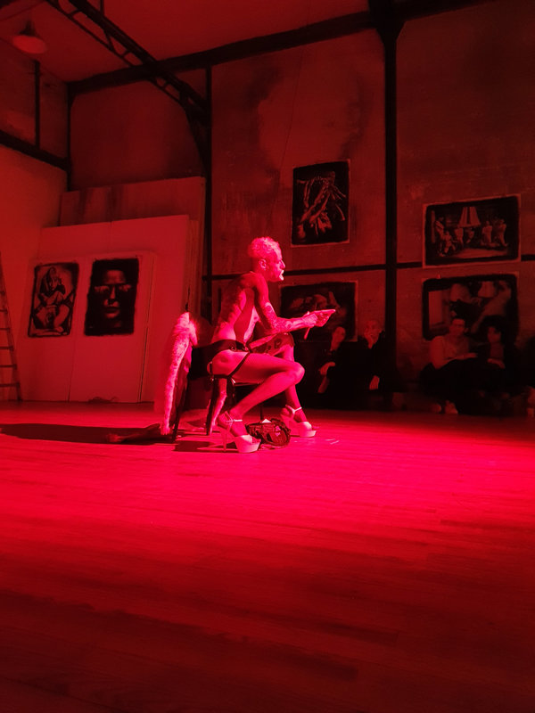 Enfin, Otomo de Manuel est entré en scène avec une allure folle, juché sur ses hauts talons, cintré dans une fausse fourrure et portant son masque de lapin. Il a épluché des carottes avec un certain sadisme 😉, s’est agrafé plusieurs déclarations sur le corps « kiss me », « eat me », « beat me »… avant de nous crier son amour de plus en plus fort ! Le tout sur une musique à vous vriller les tympans 😅
